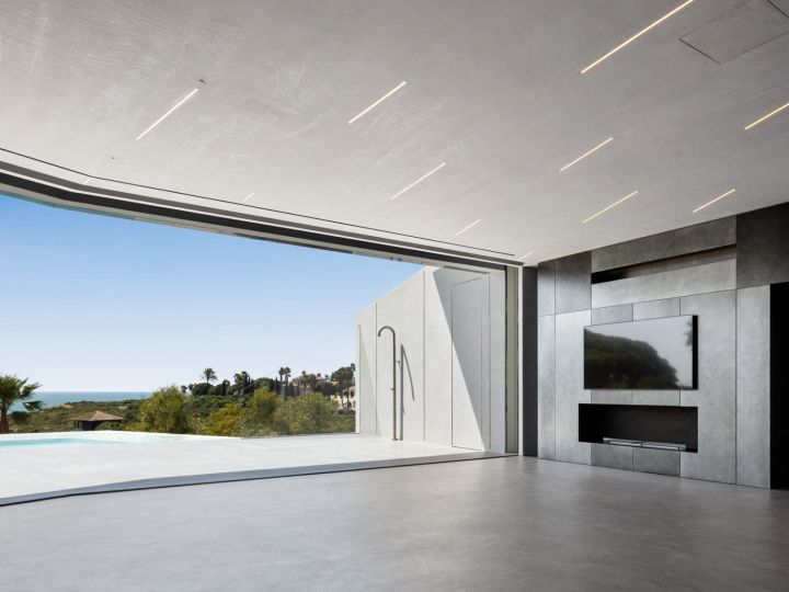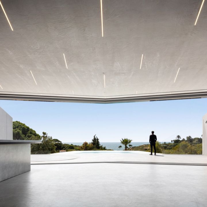 The design of this villa is a testament to the client's aspiration to create a structure evocative of the iconic imagery found in cult science fiction cinema, all while maximizing living space and embracing panoramic sea views on a narrow plot of land. Guided by the principle of the golden ratio, the organization of interior spaces was meticulously crafted, prioritizing the optimization of southern vistas and ensuring privacy from neighbouring plots. Elevating the social spaces above the private quarters served to accentuate the architectural complexity and highlight the structure's presence. The interplay between the elevated swimming pool and the residence draws a dynamic line, gracefully sculpting the landscape and imbuing the project with a sense of vitality and individuality.