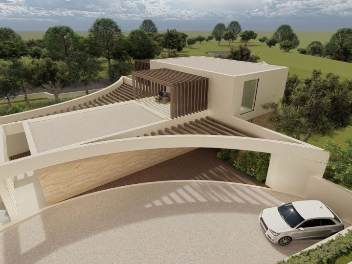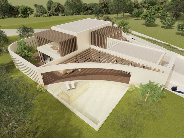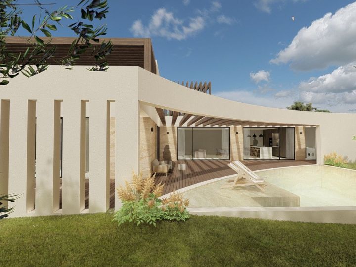 Contemporary-style villa, characterized by pergolas accompanied by large curved elements, which prevail on the spacious surrounding terraces. On the ground floor, there are three bedrooms with private sanitary facilities and walk-through closets, as well as a spacious kitchen, living room, and dining room in an open-space layout. The upper floor consists of one bedroom, a bathroom, and a closet, all with generous areas that include pergola-covered terraces and sea views.